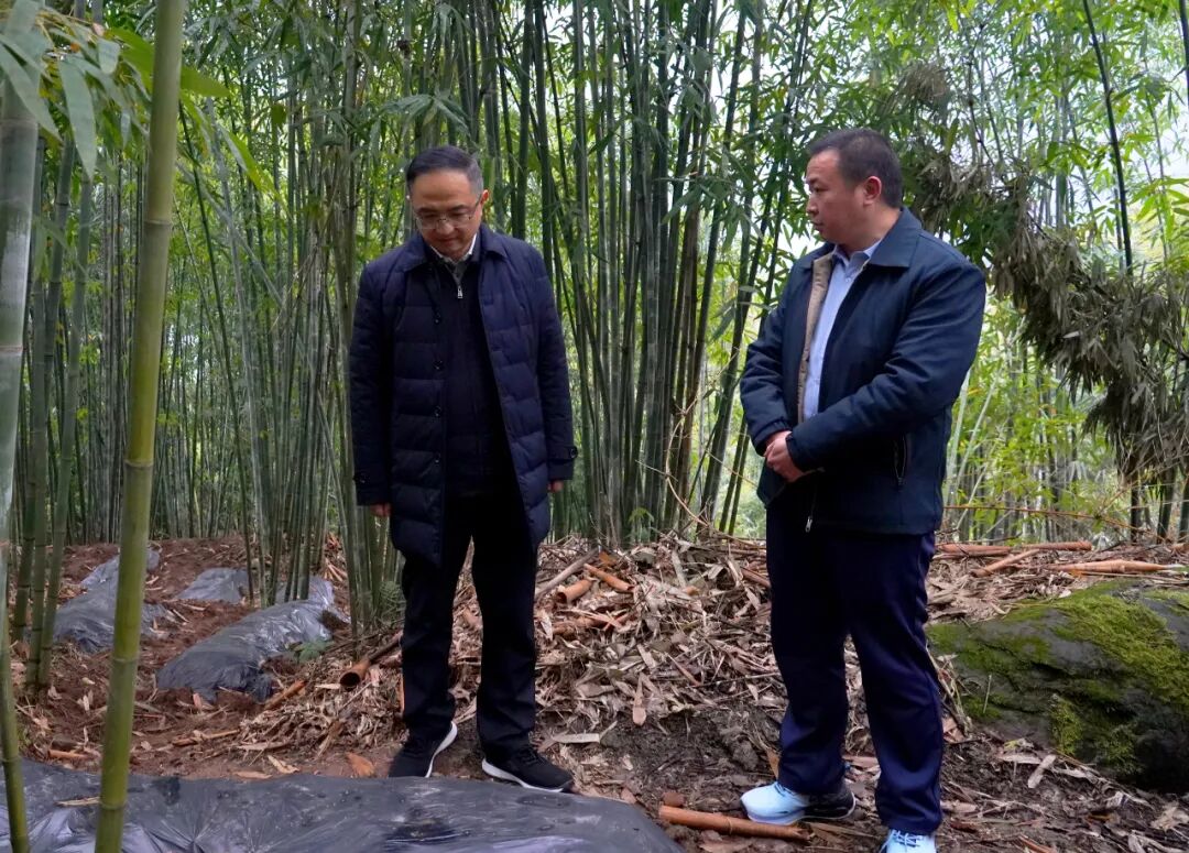 汪能科在白云乡淡竹叶和红托竹荪种植项目基地调研。